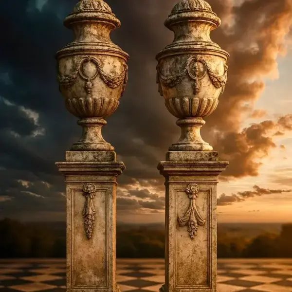Pareja de urnas ornamentales clásicas sobre pedestales