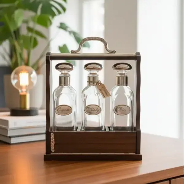 Set de licorera antiguo con botellas de cristal en estuche de madera