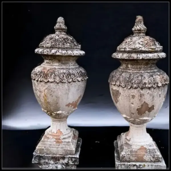 Pareja de urnas decorativas antiguas de exterior con tapa y pátina envejecida