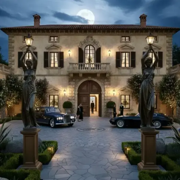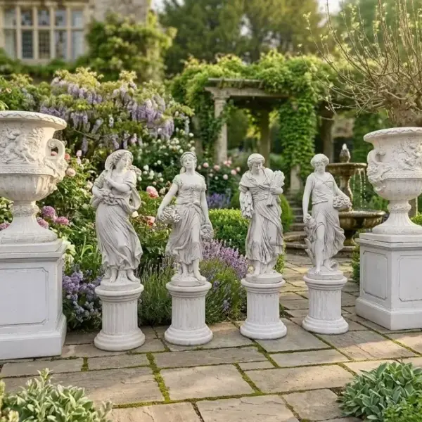 Conjunto escultórico neoclásico de jardín: cuatro figuras clásicas con pedestales y cráteras ornamentales