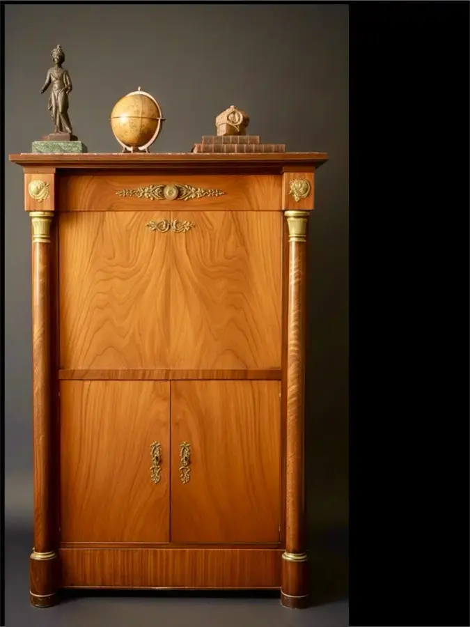 Mueble auxiliar de inspiración neoclásica, realizado en madera noble con marcada veta (tipo nogal), con columnas laterales torneadas y apliques de bronce dorado. Presenta un cuerpo superior de almacenaje tras puerta y un cuerpo inferior con dos hojas y herrajes ornamentales, aportando presencia elegante y funcionalidad. Pieza decorativa ideal para despacho, salón o recibidor, representativa del gusto clásico de finales del siglo XIX–principios del XX.