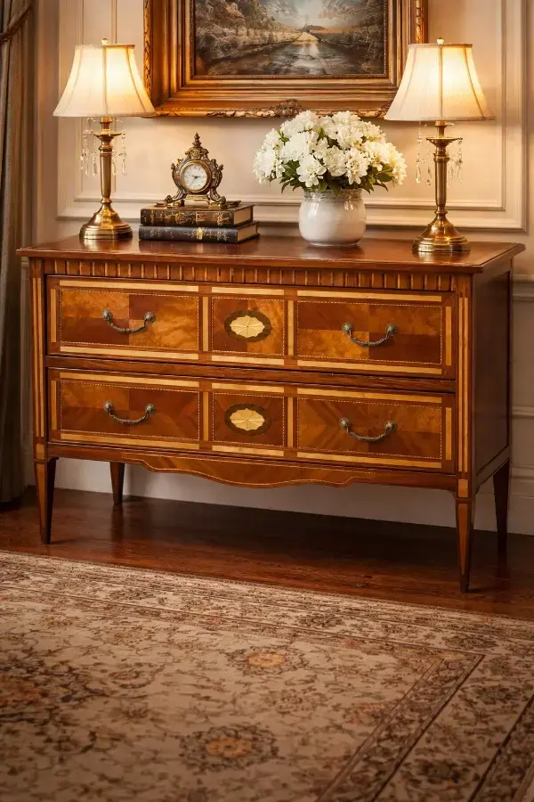 Sofisticada cómoda antigua de madera noble con marquetería geométrica e incrustaciones decorativas. Presenta dos amplios cajones con tiradores de bronce y medallones centrales, además de patas estilizadas que realzan su elegancia clásica. Pieza de gran presencia, ideal para recibidores, salones o dormitorios, aportando calidez y distinción a cualquier ambiente.