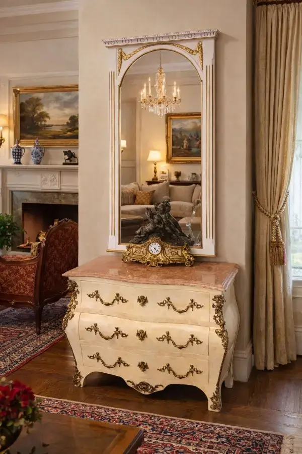 Refinada cómoda antigua de frente curvo tipo bombe, en madera lacada en tono marfil con abundantes bronces dorados (tiradores, cantoneras y aplicaciones). Presenta elegante tapa de mármol veteado en tono rosado y se acompaña de gran espejo de pared con marco a juego, rematado con molduras y detalles dorados. Conjunto de gusto francés, ideal para aportar distinción a recibidores, salones o dormitorios clásicos.
