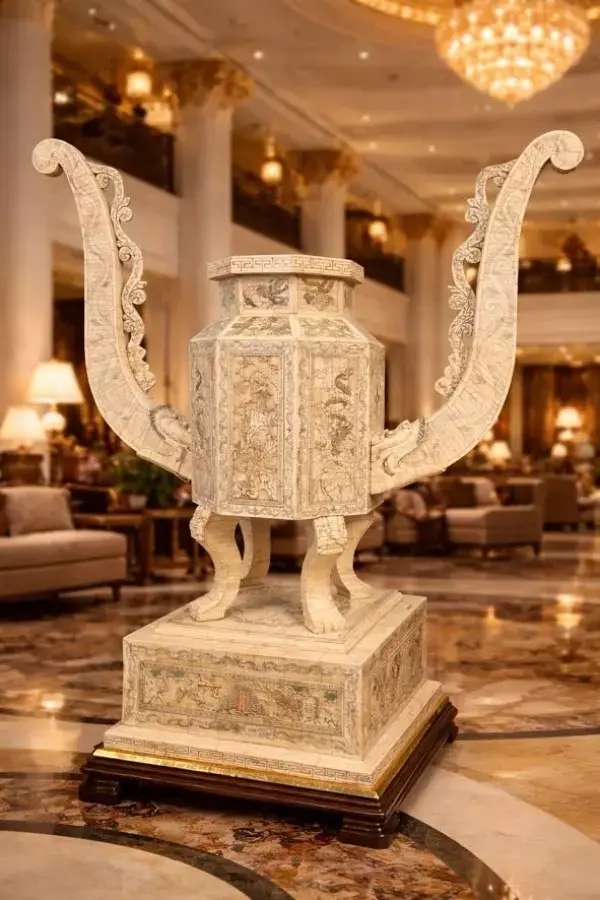 Imponente vasija ornamental de inspiración china, tipo hu, con cuerpo prismático y grandes asas curvadas a modo de ruyi. Presenta profusa decoración grabada con escenas y motivos tradicionales, montada sobre pedestal escalonado con base de madera. Pieza de gran presencia decorativa, ideal como objeto central en recibidores, salones o espacios de colección.