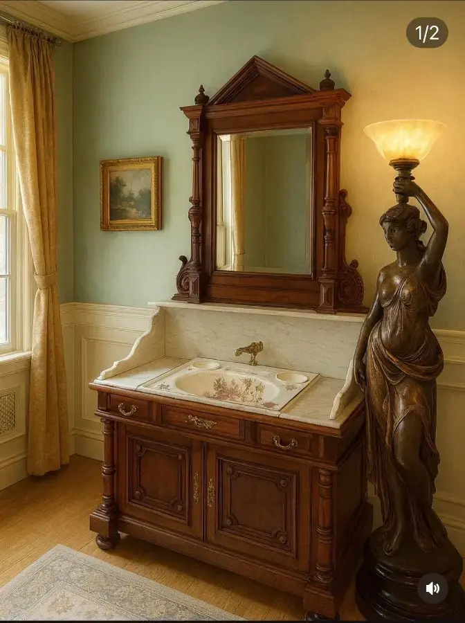 Conjunto de tocador/lavabo de época con mueble bajo en madera maciza y espejo superior enmarcado con frontón, columnas torneadas y detalles tallados. Encimera y respaldo en mármol veteado, con lavabo tipo palangana decorado y grifería de estilo clásico. Pieza elegante y funcional, ideal como mueble de baño vintage o elemento decorativo de gran presencia.