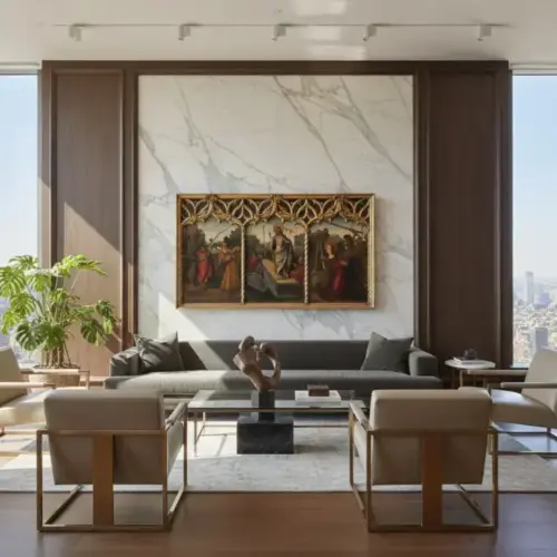 Imponente pintura al óleo de temática histórica y ambientación clásica, con figuras togadas en interior palaciego. Presenta composición narrativa dramática y una paleta cálida, enmarcada en un marco moldurado de estilo tradicional. Pieza decorativa de marcada presencia, ideal para bibliotecas, salones o espacios de aire señorial.