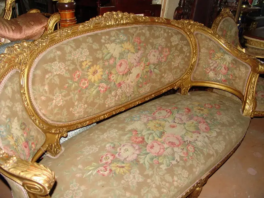 Sofá antiguo de inspiración Luis XV, con estructura de madera ricamente tallada y acabado dorado. Presenta respaldo y brazos curvos con detalles rococó, y una elegante tapicería de motivo floral tipo Aubusson/Gobelino en tonos suaves. Pieza decorativa de gran presencia, ideal para salones clásicos, recibidores o ambientes de colección.